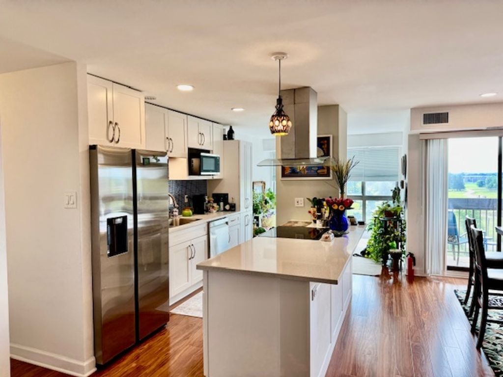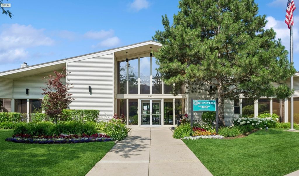 SUPER CLEAN, BEAUTIFULLY UPDATED RARELY AVAILABLE TOP FLOOR END UNIT WITH LOVELY VIEWS!! This gorgeous 2 bedroom + den and 2 full bathroom unit offers loads of natural light!! Recently updated kitchen with Samsung stainless steel appliances (Abt) , smart oven with air fry option, new cabinets (slow close), new hood, beautiful granite counter tops, new tile backsplash plus a kitchen pantry. Spacious living and dining room with balcony off of dining room features pond and fountain views. Perfect for entertaining ! Huge master bedroom with ensuite double sink master bath and large walk in closet. Second bedroom has closet and access to hallway full bathroom with walk-in shower. In addition, a spacious walk in utility closet. Tons of storage! Den can be office, family room, play room or even a 3rd bedroom. Unit has south exposure so no extreme sun facing east or west. Newer floors and window treatments. Brand new Trane HVAC unit still under warranty. One heated indoor garage parking spot with plenty of outdoor surface lot parking. Enjoy the indoor pool, clubhouse, library, and fitness center. A fabulous value in an excellent school district!! Don't miss this fabulous condo!!!